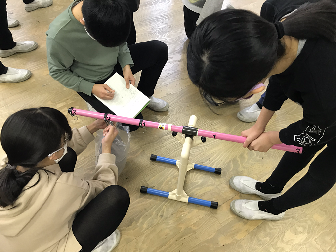 令和2年12月14日 【6年生】てこのはたらき実験 ページ番号1004196 更新日 令和4年3月26日 印刷大きな文字で印刷 理科の学習では、単元「てこのはたらき」が始まりました。実験器具を用いて、支点・力点・作用点と押し具合(手ごたえ)の関係を調べています。各グループから、「手ごたえが全然違う。」、「予想と違った。」等の声が次々と上がりました。この実験をもとに、さらに学習を深めていきます。