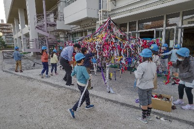 まず、大きな紙袋に新聞紙をたくさん詰め込んで土台を作りました。そこに色とりどりの花紙を洗濯のりで貼り付けました。土台を外した後、鼻や目などを花紙で作り、それぞれのイメージに近づけました。