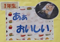 「ああ おいしい」という作品で自画像に食べたい物が立体として表現されています。本会場である体育館には、児童が選んだ絵が展示されています。