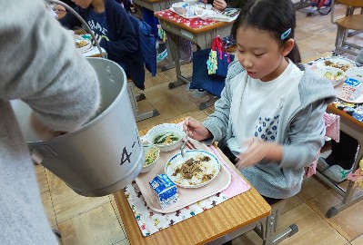 「給食を作ってくださった調理員さん方に感謝していただきます!」の号令により、笑顔でいただきました。