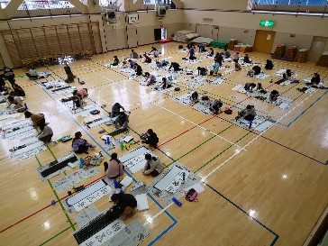 広い体育館で、ディスタンスをとりながら取り組みました。体育館にも暖房が入ったおかげで、暖かく授業が進みます。