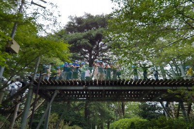 ▲きょうだい班毎にチャレンジコースを楽しみました。アスレチックのチャレンジコースは、小学生から大人まで楽しめるコースです。難しいポイントがたくさんあるので、油断は禁物です。気合を入れて進んで行きました。