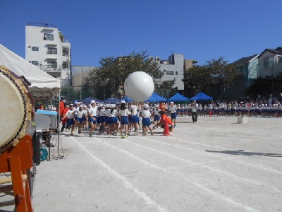 1・2年生は大玉を転がし、3年生からは大玉を頭上で送ります。団結力が勝敗のカギです。