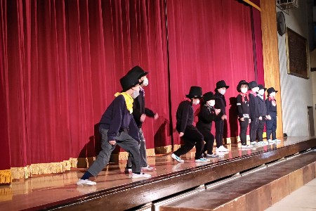 ▲ある町の静かな夜、この町の人たちの夢を盗もうと、夢泥棒たちが現れます。ところが、この国の王様のせいで、町の人が夢を見られなくなっていることを知り・・・。元気な2年生の演技と歌をお楽しみください。