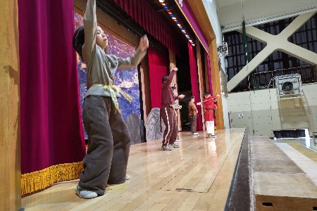 ▲不思議なことが大好きな少女ピコが、幽霊の少女マコに出会い、一日だけという約束のもと、二人は入れ替わることに。生と死との間で、二人の友情が試されます。舞台背景・衣装・照明・音楽も自分たちで作り上げる6年生のステージをお楽しみください。