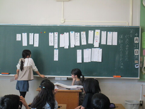 校長講話では次のようなことを話しました。 〇前回はかけっこ・短距離走で「ゴールを走る抜けろ」という話をしましたが、今日は、表現種目について話をします。覚えてできるようになったことを、さらに美しく、ダイナミックにしましょう。どんなところで、自分をもっとかっこよく表せるか考えてみましょう。自分がその気持ちにならないと表現の仕方は変わりません。自分をかっこよく、そして皆と合わせる楽しさを感じてください。 〇今朝、応援団が練習をしていました。月曜の朝から一生懸命に練習をしていて、とても立派でした。明日は応援集会があります。皆で盛り上げていきましょう。 〇今日は急に寒くなりました。衣服の調節をして体調を崩さないようにしましょう。