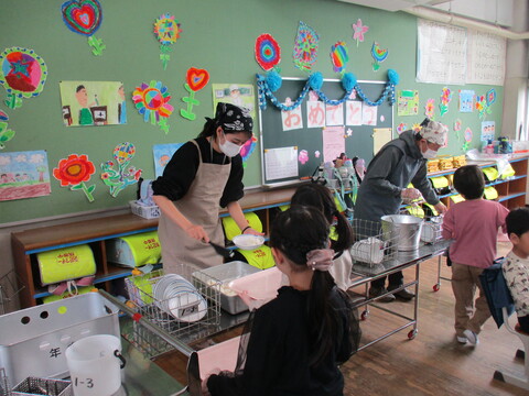 今日のメニューは米粉のカレーライス。3時間目から準備の仕方を説明し、給食の準備を始めました。