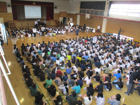 体育館に集まり、校歌と「翼をください」(作詞:山上路夫 作曲:村井邦彦)を歌いました。指導は音楽専科教員です。元気な歌声でした。全身を使って力強く歌っている子供が多くいて、歌声が体育館中に響き渡りました。終わった後に自然と拍手をしていました。