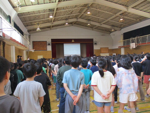 全校が昼休みに集まって全校集会を行いました。多くの学校では月曜日の朝に全校朝会を行いますが、本校では、月曜日の昼休みに全校昼会ならぬ全校集会を行います。気候のよいときは全校で集まりますが、猛暑だったり寒かったりするときには、学年を半分に分けて体育館で行います。人数が多いので、そうなると、子どもたちは隔週で全校集会に参加することになります。