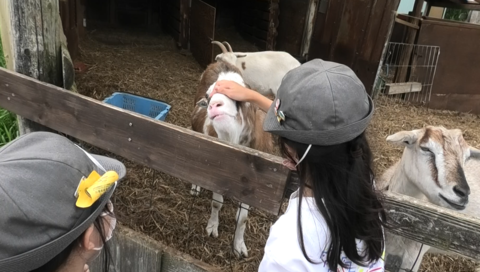 ヤギ、ヒツジ、ブタの中で、自分がふれあいたい動物を選んでエサをやりました。