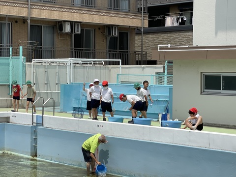 6月3日(金曜日)ヤゴとりをしました ページ番号1009934 更新日 令和4年10月25日 印刷大きな文字で印刷 ヤゴとりをしました 3年生とわかくさ学級の3,4年生がヤゴとりをしました。プール清掃が始まる前に、何匹救出できるでしょうか。 天気が急に悪くなるかもしれなかったので、児童はプールサイドからの参加となりました。 「先生!そこにヤゴいるよ!」と、プールサイドからたくさんのヤゴを見つけました。