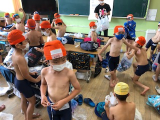 6月16日 1年生 水泳の学習 ページ番号1010120 更新日 令和4年10月25日 印刷大きな文字で印刷 雨もやみ、水泳の授業実施の予定でしたが 残念ながら気温・水温が足らず・・・・ プールに入ることはできませんでしたが着替えの練習をしました。 初めての着替え、上手にできるかな?自分の洋服をしまうところは? 着替えが終わったら廊下に並んで体育館に出発です。 体育館では、真ん中をプールに見立てて笛の合図や入り方の確認です。 約束を守って、安全に水泳の学習を行っていきます。 明日は晴れるかな?