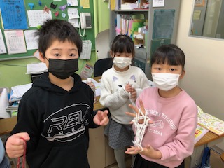 休み時間、2年1組のみんながあやとりをしていました。「校長先生、グーを出してください。」と言われ、グーを出すと、くるくる巻いてスポッと入れて、あら不思議、魔法のようにほどけました。「すご~い。」の言葉に嬉しそうでした。他のみんなもいろいろな技を見せてくれました。私も小学生のときに、夢中になった時期がありました。一人でも友達とも遊ぶことができるあやとり。ぜひ、家でも家族みんなとやってほしいです。