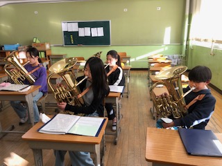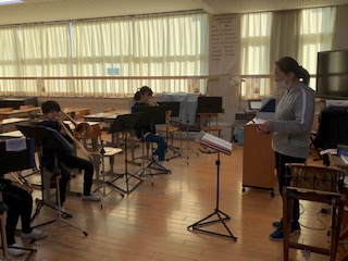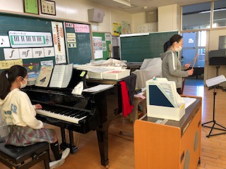 4年生も練習を重ね、しっかりした音が出せるようになっています。今日は、3・4時間目に「6年生を送る会」が予定されていました(代表委員会の児童は司会等の練習があり今日の練習は途中までの参加でした)が、その中でも6年生のボランティアお手伝いもたくさん来てくれていました。また、現在、特別支援教育補助員として勤務している宮崎先生と特別支援教室介助員として勤務している野間先生は学生時代に吹奏楽の経験があり、子どもたちの指導に入ってくれています。6年生に教えてもらえるのもあとわずかです。6年生が安心して卒業できるように、4年生も5年生もこれからも頑張ってほしいです。
