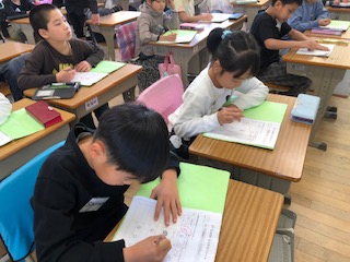 3時間目、3年3組が英語の学習で「できる」「できない」の言い方や、スポーツや趣味等の言い方の練習をしていました。「できる・できない」を伝える時、スポーツや趣味によって、「play」を使ったり、「play the」を使ったり、「do」を使ったり、そのまま使ったりする違いがあり、難しいですが、子どもたちは、しっかり区別をつけて、自分ができること、できないことを友達や先生に伝えていました。少しくらい間違えていてもジャスチャー等を交えながら堂々と言えることが大切ですね。