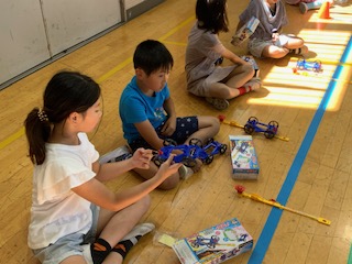 19日 3年生 理科 ページ番号1017646 更新日 令和6年6月19日 印刷大きな文字で印刷 3年生の理科の学習の様子を紹介します。 5時間目、3年1組が体育館で理科の学習をしていました。「ゴムと風の力のはたらき」の学習で、ゴムの力で動く車を走らせました。前回は、ゴムを伸ばす長さを10cmと15cmにして、走る距離を比べました。今回は、ゴムを1本と2本にして、走る距離を比べました。実験の前に予想をしてから、実際に走らせて確かめました。予想や実験を通して、問題を解決していく力が高まっています。