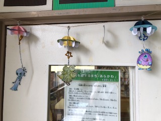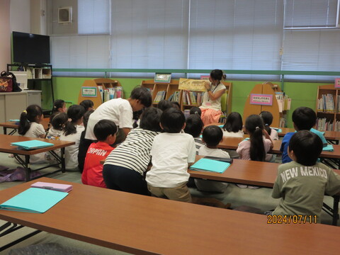 今年度より復活した図書ボランティアさんの活動、休み時間や尾久西タイムに読み聞かせをしてくださったり、廊下の掲示物を作ってくださったりしています。今、3階の入口は「宇宙」、2階の入口は「夏祭り」の飾りが掲示してあります。素敵すぎて見入っている子どもたちがたくさんいます。英語の本の読み聞かせもしてくださっています。写真は尾久西タイムや図書の時間、中休みに行った読み聞かせの様子です。読み聞かせをしながら、英語でのやり取りもしてくださり、子どもたちも大盛り上がりでした。楽しい時間をありがとうございます。