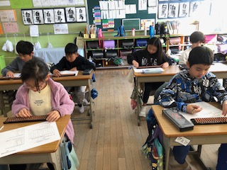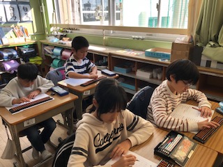 1時間目、4年1組がそろばん教室を実施していました。2・3組もこのあと実施します。講師は、荒川区でそろばん教室の先生をしている川口嘉治先生です。川口先生はたくさんの学校で講師をされていて、本校でも毎年、来ていただいているので、4年生の子どもたちは、昨年度も教えていただきました。今回は、まず3年生の復習をしたあと、けたの多い足し算や引き算などを学習しました。今後、小数の足し算や引き算にも挑戦していきます。熱心に話を聞いて一生懸命学んでいました。