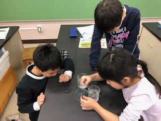 10日 4年生 理科 ページ番号1018749 更新日 令和6年12月10日 印刷大きな文字で印刷 4年生の理科の学習の様子を紹介します。 1・2時間目、4年2組が理科室で理科の学習に取り組んでいました。空気の温度と体積の関係を実験をしながら確認していました。空気は目に見えないので、試験管の先に石鹸水をつけて空気の体積が変化する様子を調べていました。試験管を氷水に入れたりお湯に入れたりすると、変化の様子がはっきり目で見てわかり、びっくりしていました。