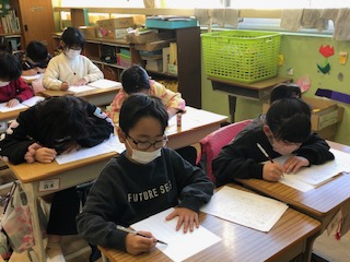 23日 2年生 書き初め ページ番号1018819 更新日 令和6年12月23日 印刷大きな文字で印刷 2年生の書き初めの練習の様子を紹介します。 3時間目、2年1組が書き初めの練習に取り組んでいました。1・2年生は硬筆です。お手本を見ながら集中して取り組んでいました。前回練習した作品を参考にしたり、今日のめあて「ますめの中心をいしきして書く」ことに気を付けたりしながら、一生懸命練習していました。冬休みの練習も頑張ってほしいです。