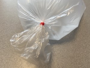 (3)膨らませたら、袋の口を輪ゴムで結びます。袋がパンパンになるくらい膨らませると、遊ぶ時に弾みやすいです。