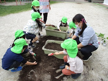 令和4年5月9日 <年長組>野菜の苗を買いにいきました ページ番号1009845 更新日 令和4年6月1日 印刷大きな文字で印刷 年長組は、花屋さんへ野菜の苗を買いにいきました。事前に学級で、どんな野菜を育てたいか、今の季節でよいか、調べたり相談したりしてから行きました。 支払いも、おつりのやりとりもしました。年中組の分も買いましたよ! 年中組さんの分、買ってきたよ みんなで土作りです。栄養を混ぜて、元気に育つ土をつくります。 そっとポットから苗を外します。 ナスの苗を丁寧に植えました。これから大きくなるのが楽しみです。