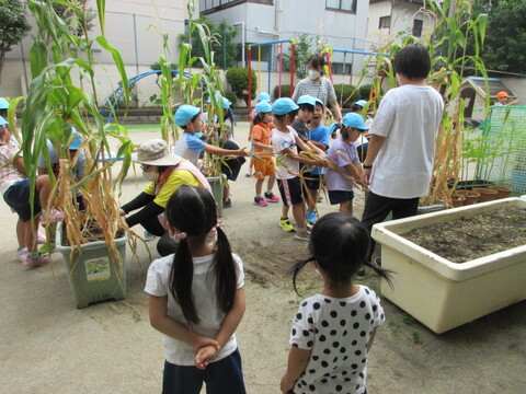 年長組がポップコーンの茎を抜く様子を興味深そうに見ていました。