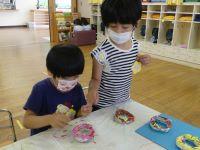 沢山売れたら、新しいドーナツのトッピングの準備もみんなでしました。園庭では、大きなケーキ作り!今日は2段ケーキにしてみよう!